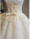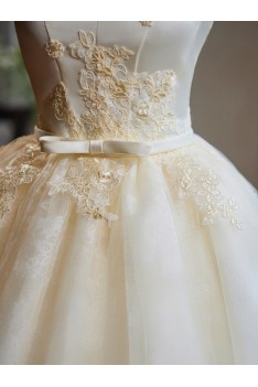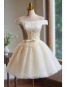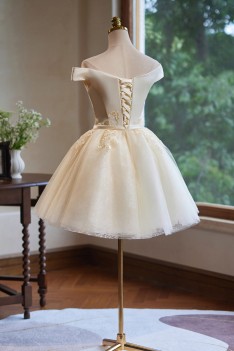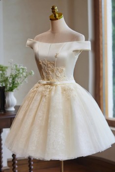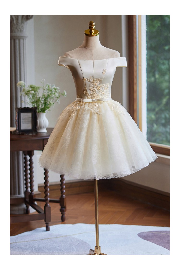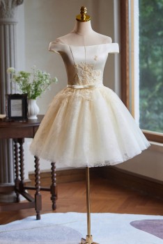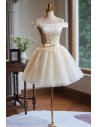 Champagne Homecoming Dress with Cap Sleeves Satin Bodice and Lace Applique Short Length for Prom