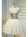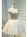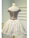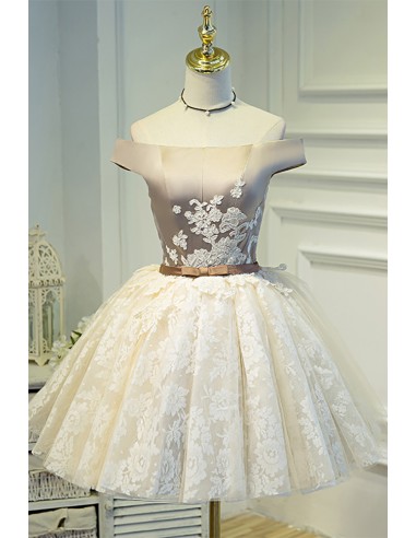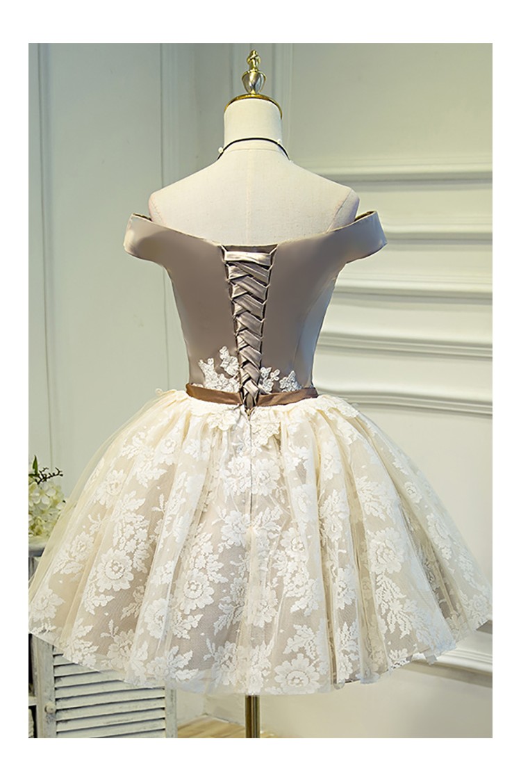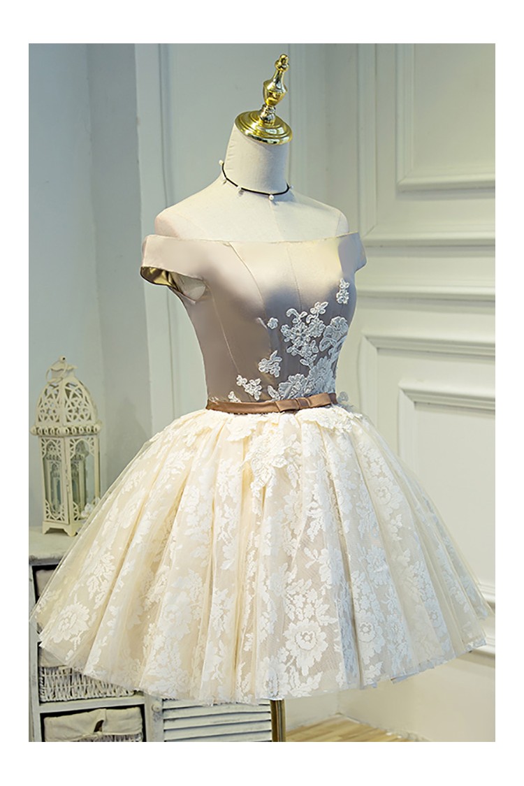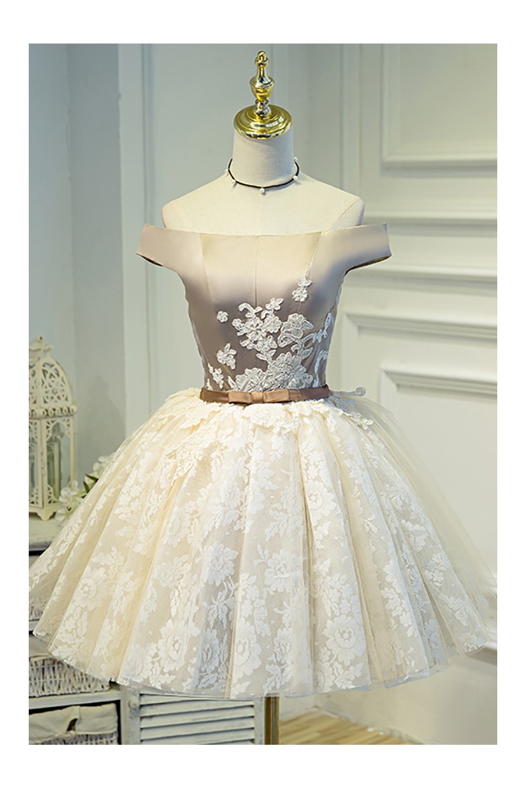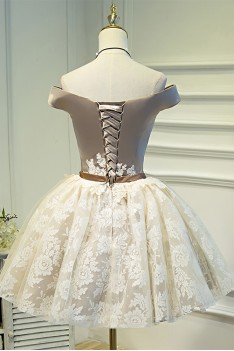 Champagne Off-Shoulder Lace Puffy Tulle Short Ballgown Prom Homecoming Dress